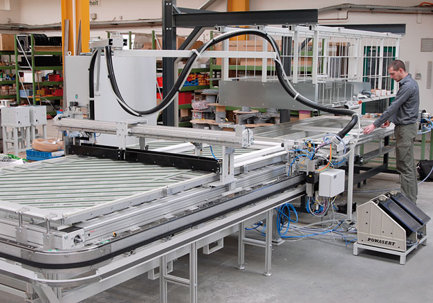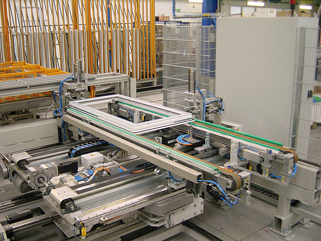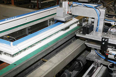 Zum Ablängen der Getriebe und Scheren stellt sich der Positionieranschlag automatisch auf das richtige Maß. Die Beschlagteile werden manuell eingesetzt. Die Verschraubung übernimmt der Flügel-Anschlagautomat. Je nach geforderter Kapazität stehen 4 unterschiedliche Varianten zur Verfügung: