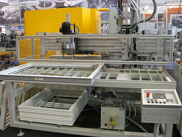Zum automatischen Bohren, Setzen und verschrauben von Eck- und Scherenlagern und/oder Drehbändern mit manueller Rahmenpositionierung.